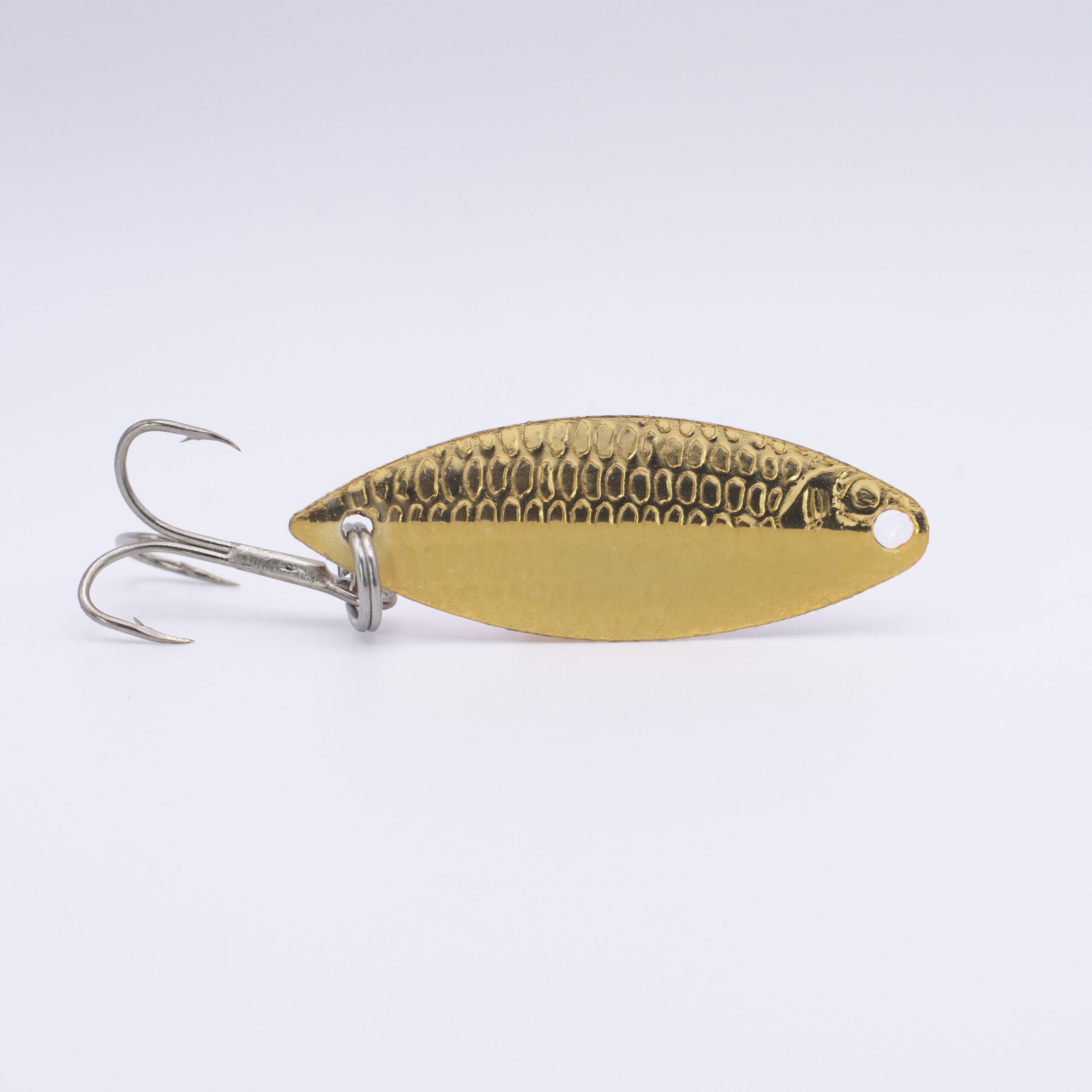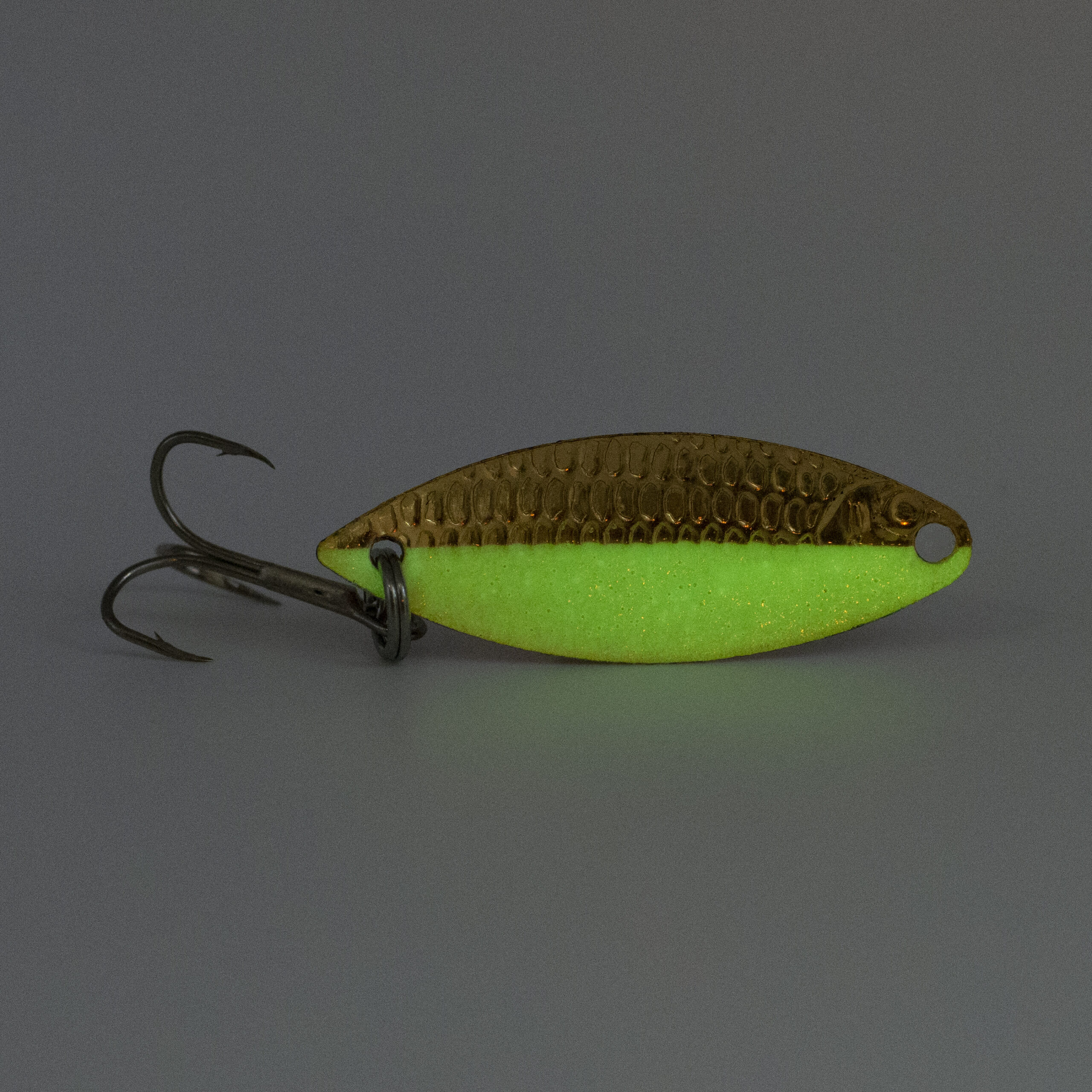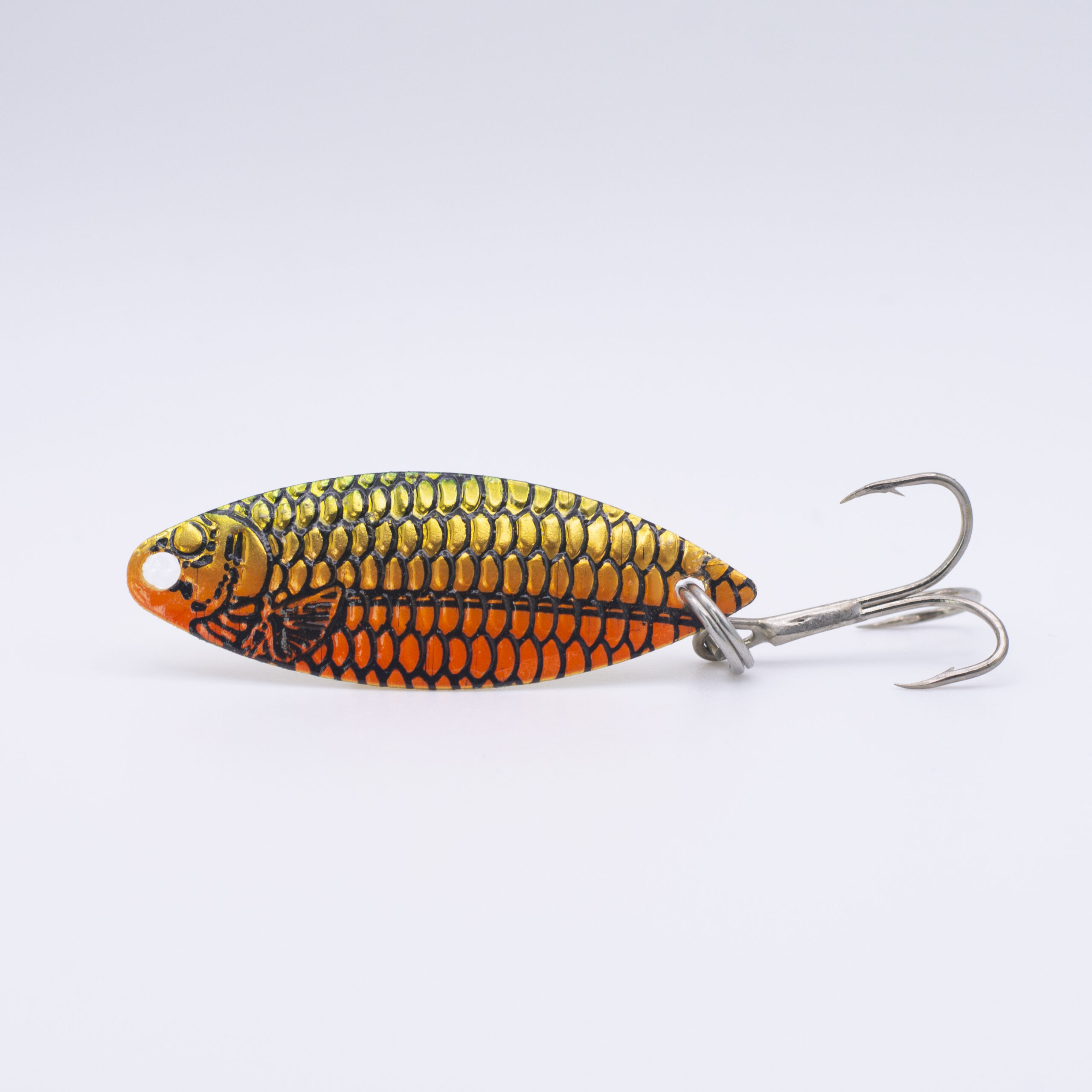 Designed to mimic the flash and movement of a young baitfish, the Bass Fry is a handcrafted spoon lure with a metallic scale-textured body in rich gold, orange, and black. A hand-painted glow-in-the-dark coat covers half of the concave side, creating a luminous flash in low light and deep water. Both sides are finished with a hand-applied UV coating, enhancing durability and underwater visibility.