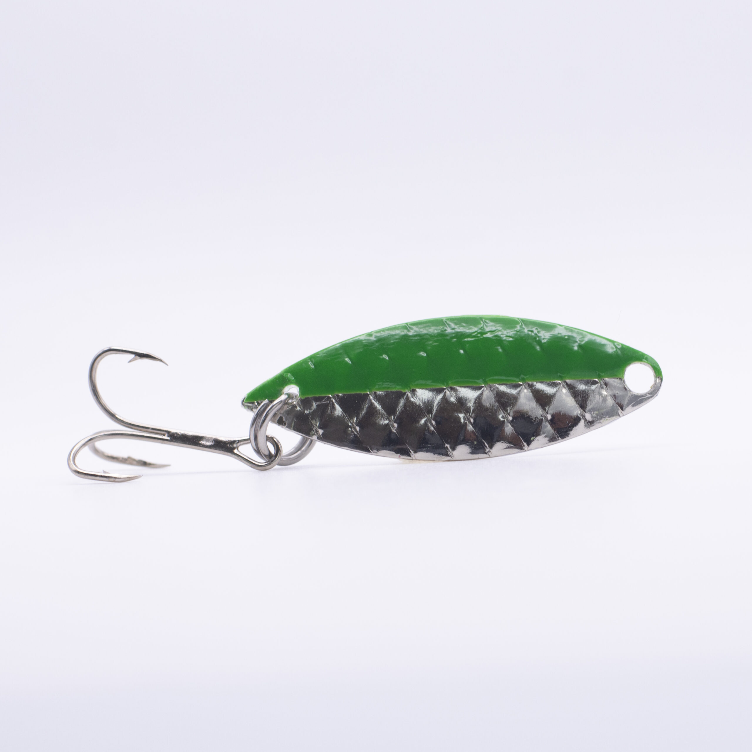 -Precision meets flash in this emerald powerhouse. The Green Machine UV is a textured spoon lure with a hand-painted emerald green back and metallic silver belly with an added white detail on the concave side, designed to mimic baitfish with striking realism. Its diamond-patterned surface throws light in all directions, while the UV-reactive finish boosts visibility in deep or stained water.