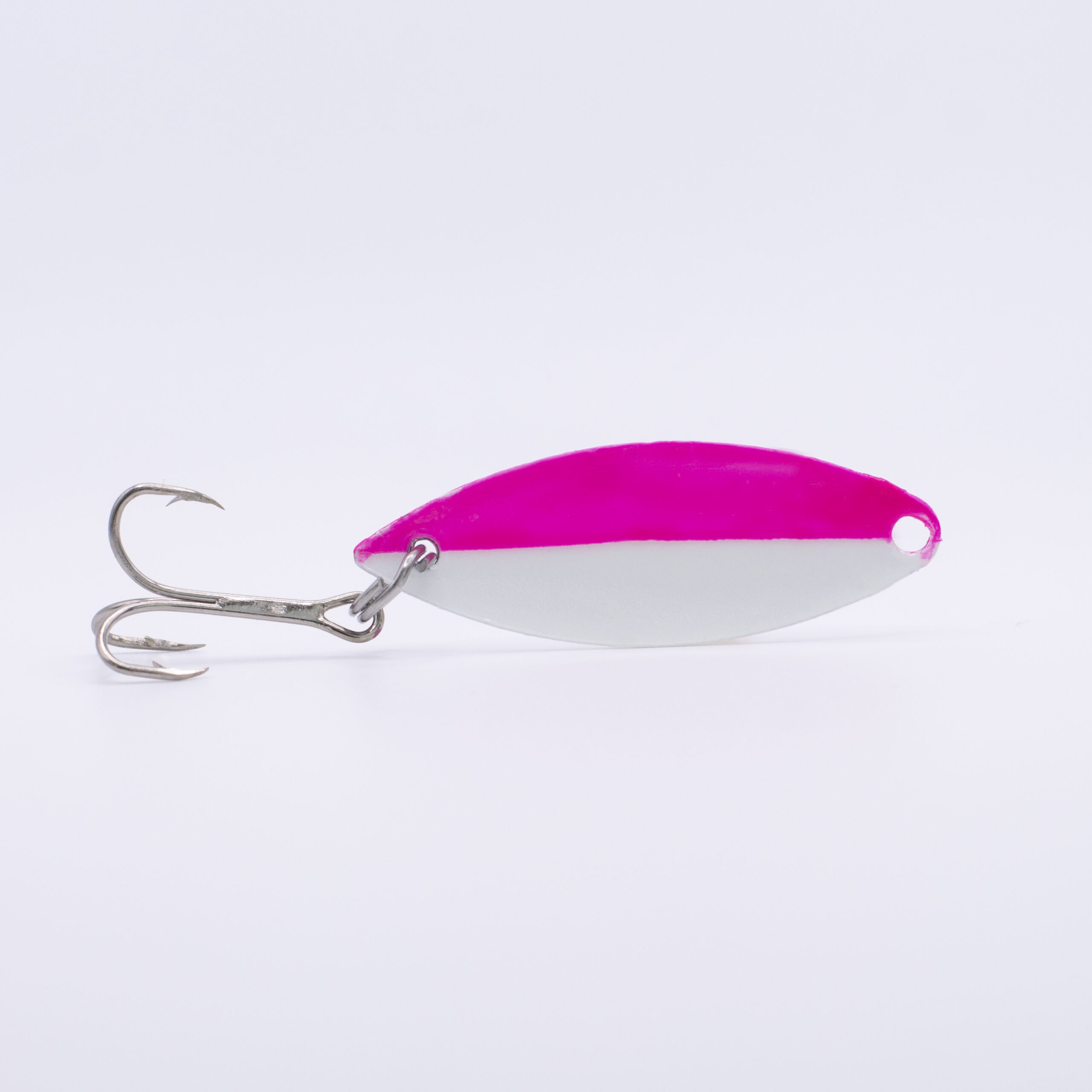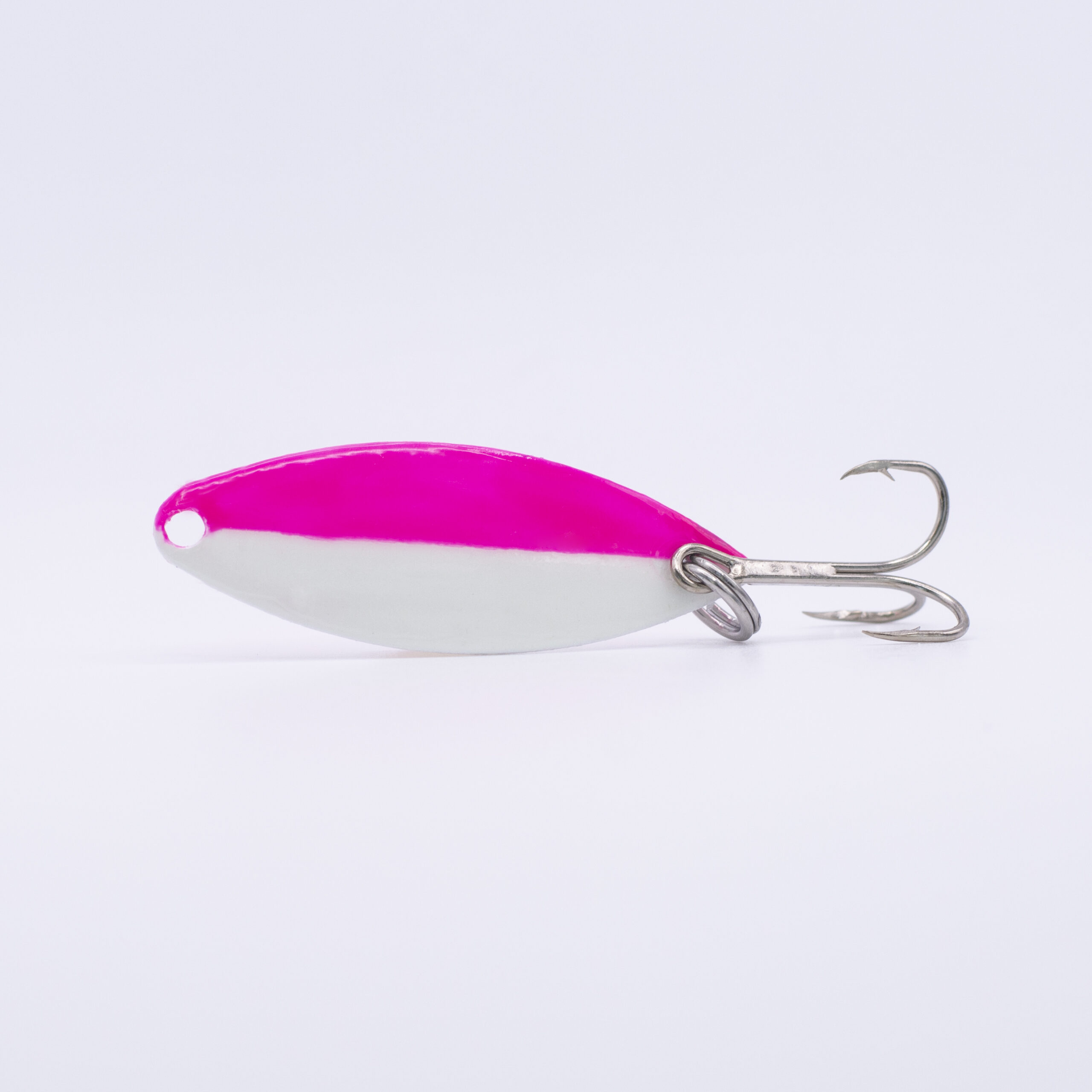 Sweet on the surface, savage in the strike zone. Pink Kiss is a handcrafted, American-made spoon lure painted in a bold half-white, half-pink finish that flashes with every flick. Designed to mimic the flash of baitfish and provoke aggressive Kokanee bites, it’s sealed with a UV-reactive top coat for added visibility in deep or cloudy water.