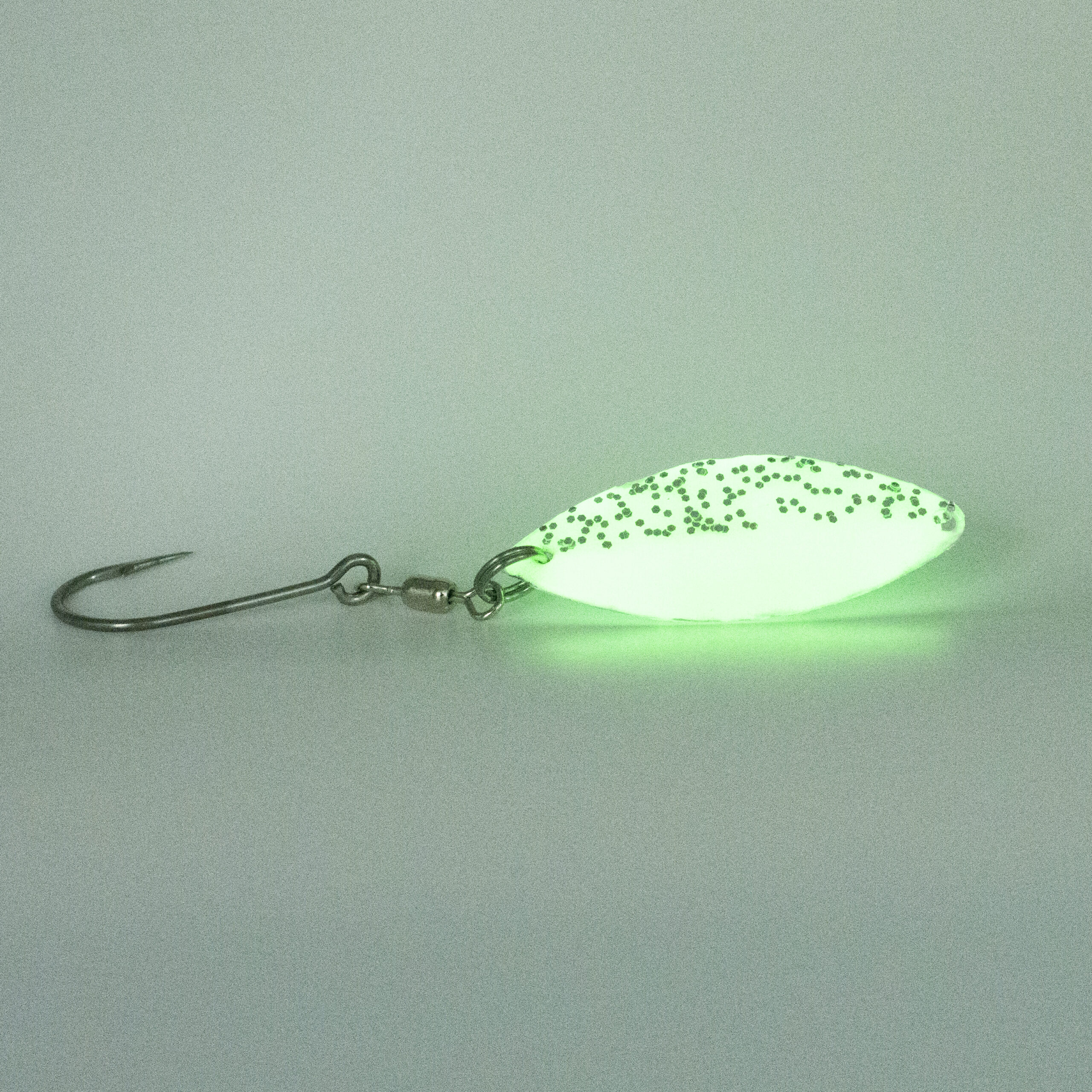 The Ultimate Trolling Lure – Built to Sparkle, Designed to Deliver. Super Mint UV is a handcrafted glow-in-the-dark spoon lure layered with hand-painted glitter and luminous paint on both sides. Designed to light up like a shamrock in dark water, it features a flashy silver scale finish, reactive fluorescent color, and a UV-reflective coating that triggers aggressive bites from salmon in any condition.